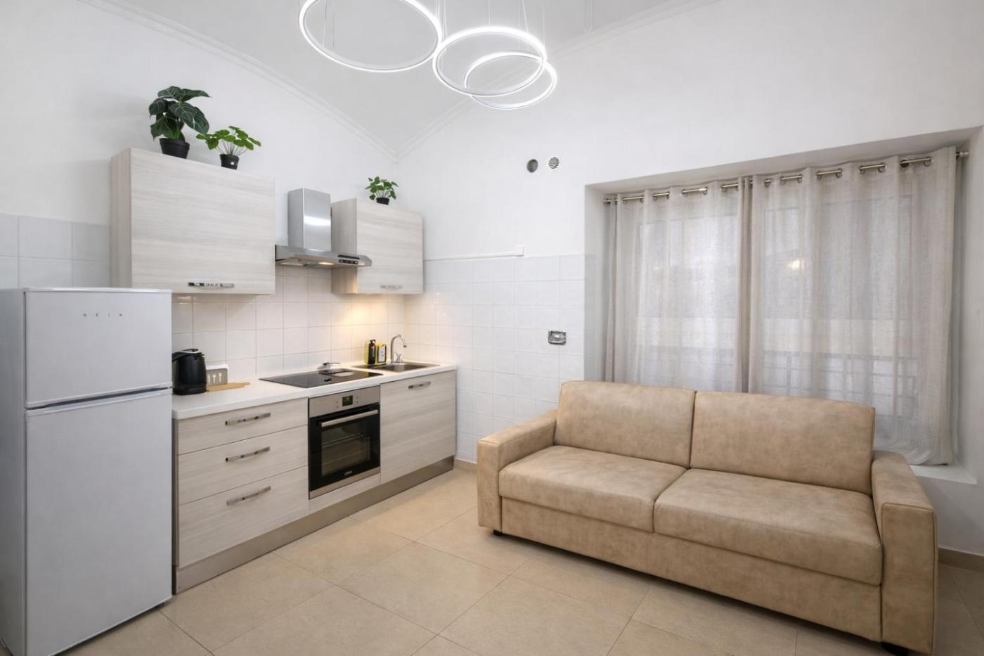 Questo appartamento prevede 1 camera da letto, un soggiorno e una cucina con utensili.